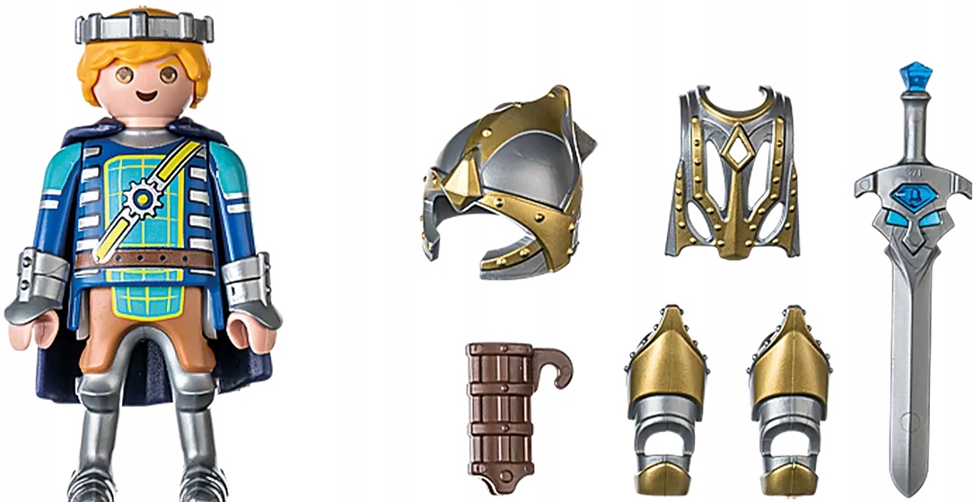 Arwynn z Invincibusem Numer katalogowy: 71301 Seria: Novelmore Wiek: od lat 4+ Ilość elementów: 11 Wymiary figurki: 7,5 cm Zestaw zawiera: Figurki: 1 rycerz; Akcesoria: 1 korona, 1 peleryna, 1 kołczan, 2 naramienniki, 1 napierśnik, 1 hełm, 2 naramienniki + Najnowszy katalog Playmobil 2023